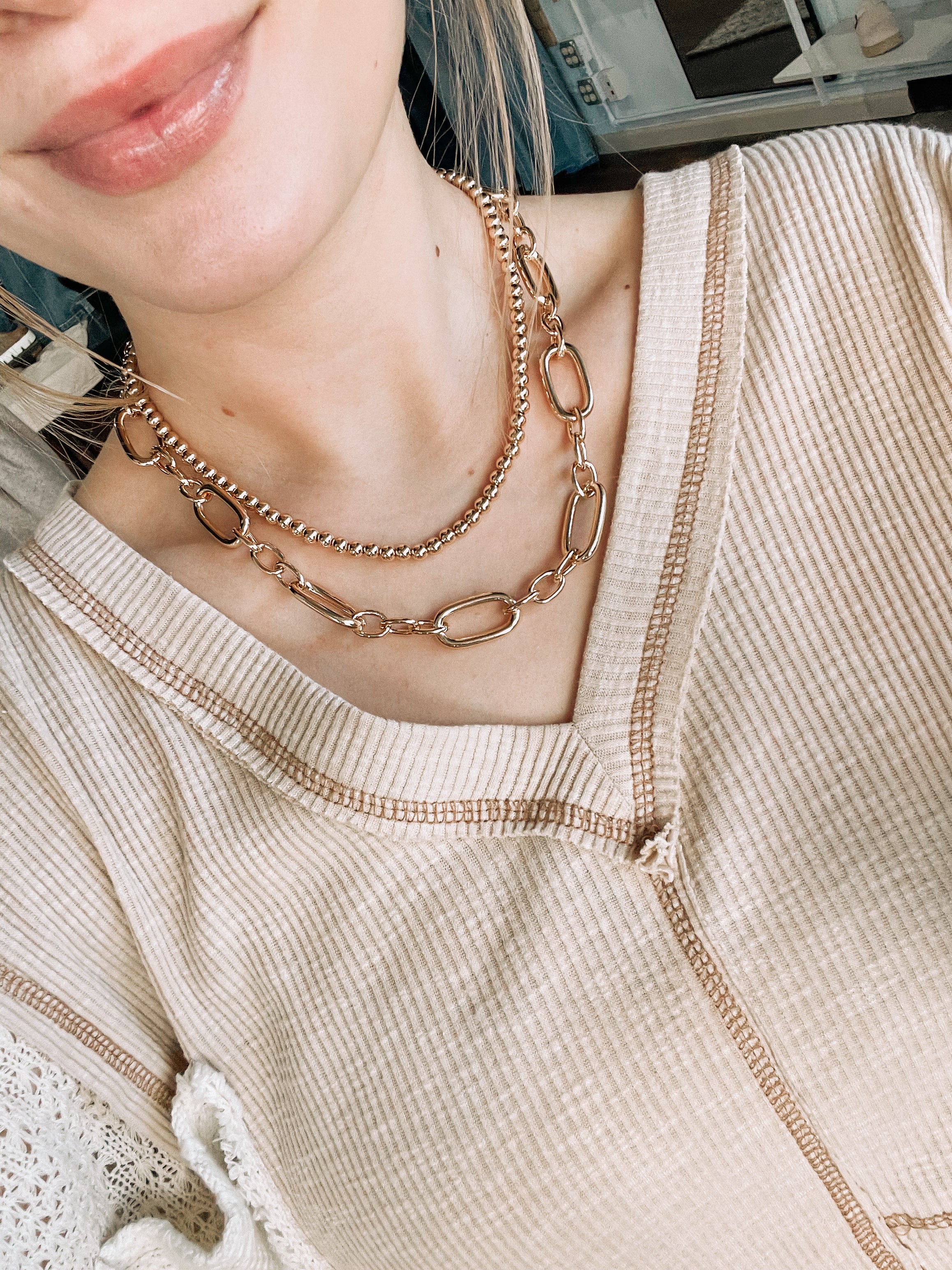 Gold beaded + chain layered multiway 16"-18" necklace! Can be worn in multiple ways to match different outfits and occasions!