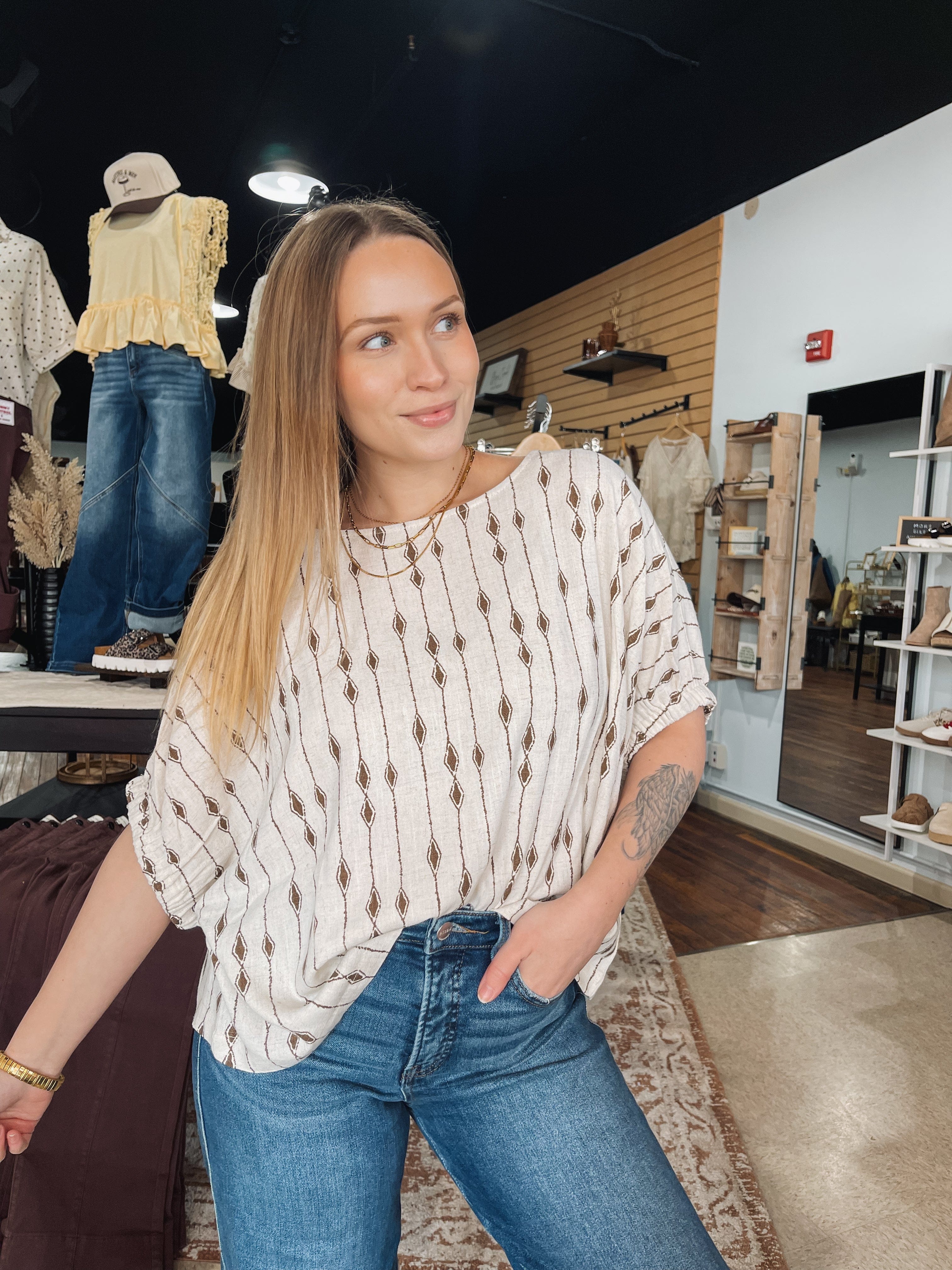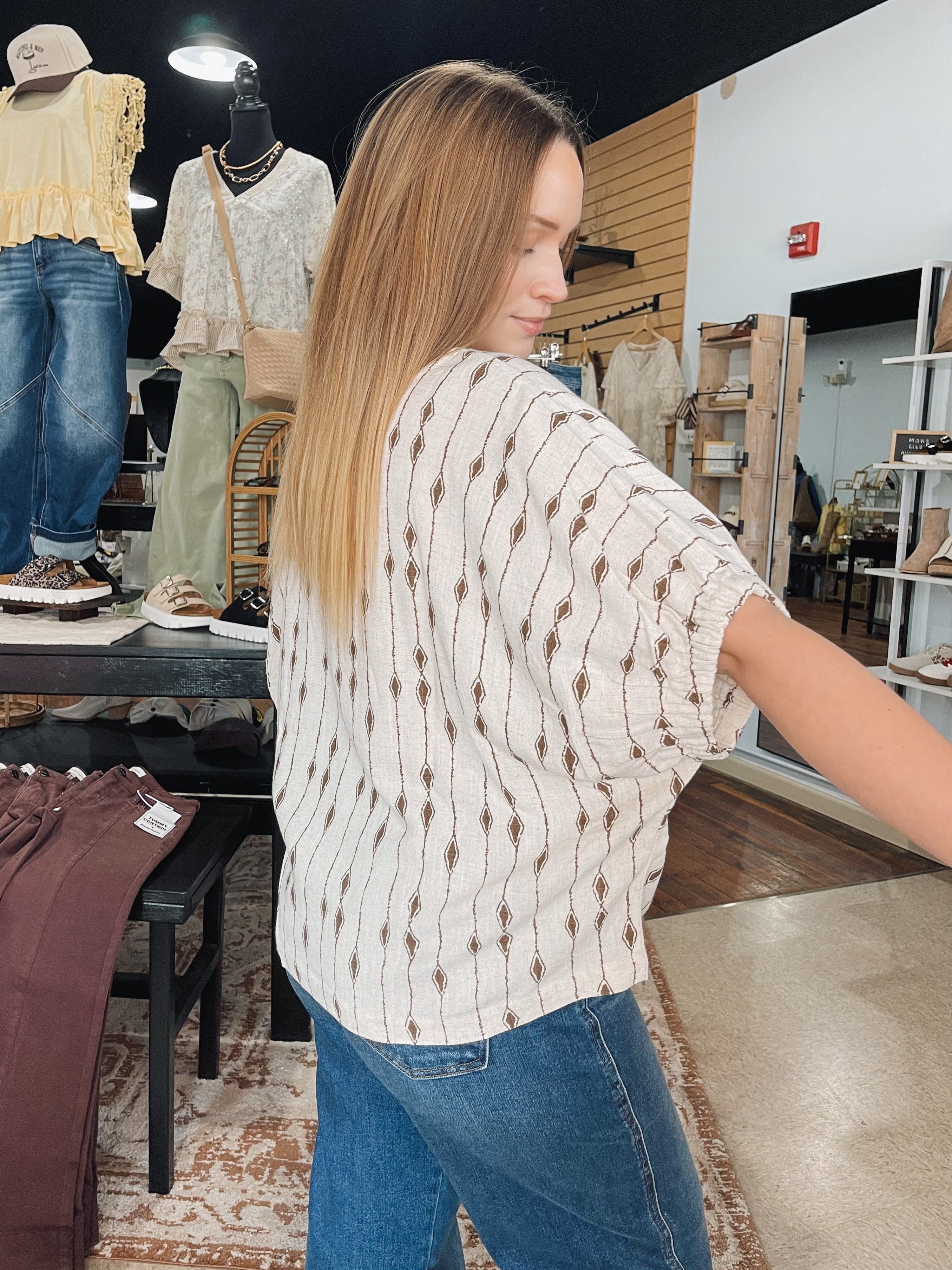 A top for those days you want to throw on a top & go *while still looking cute!* A unique pattern that feels elevated! TTS, Erin’s wearing a size Small!