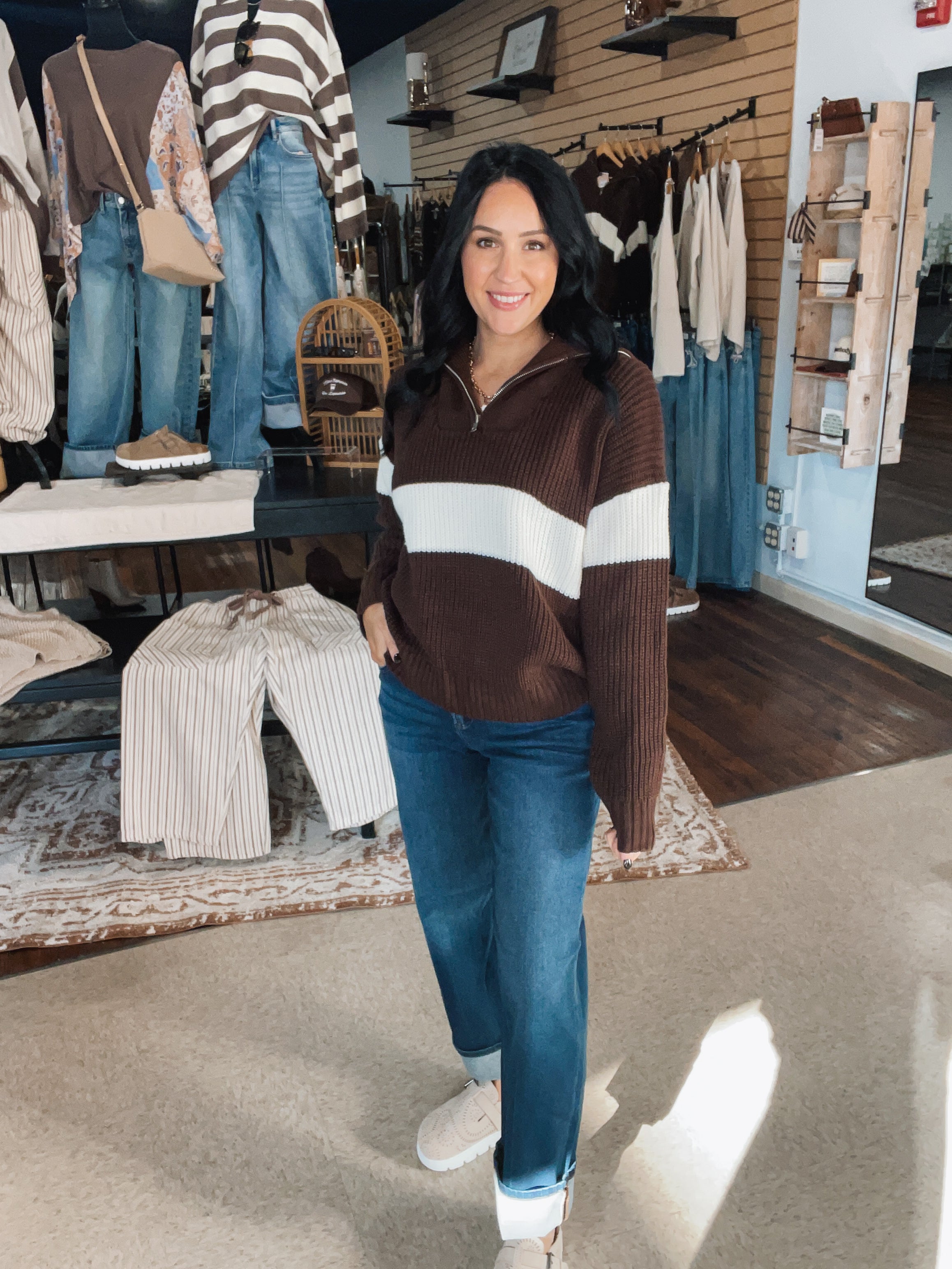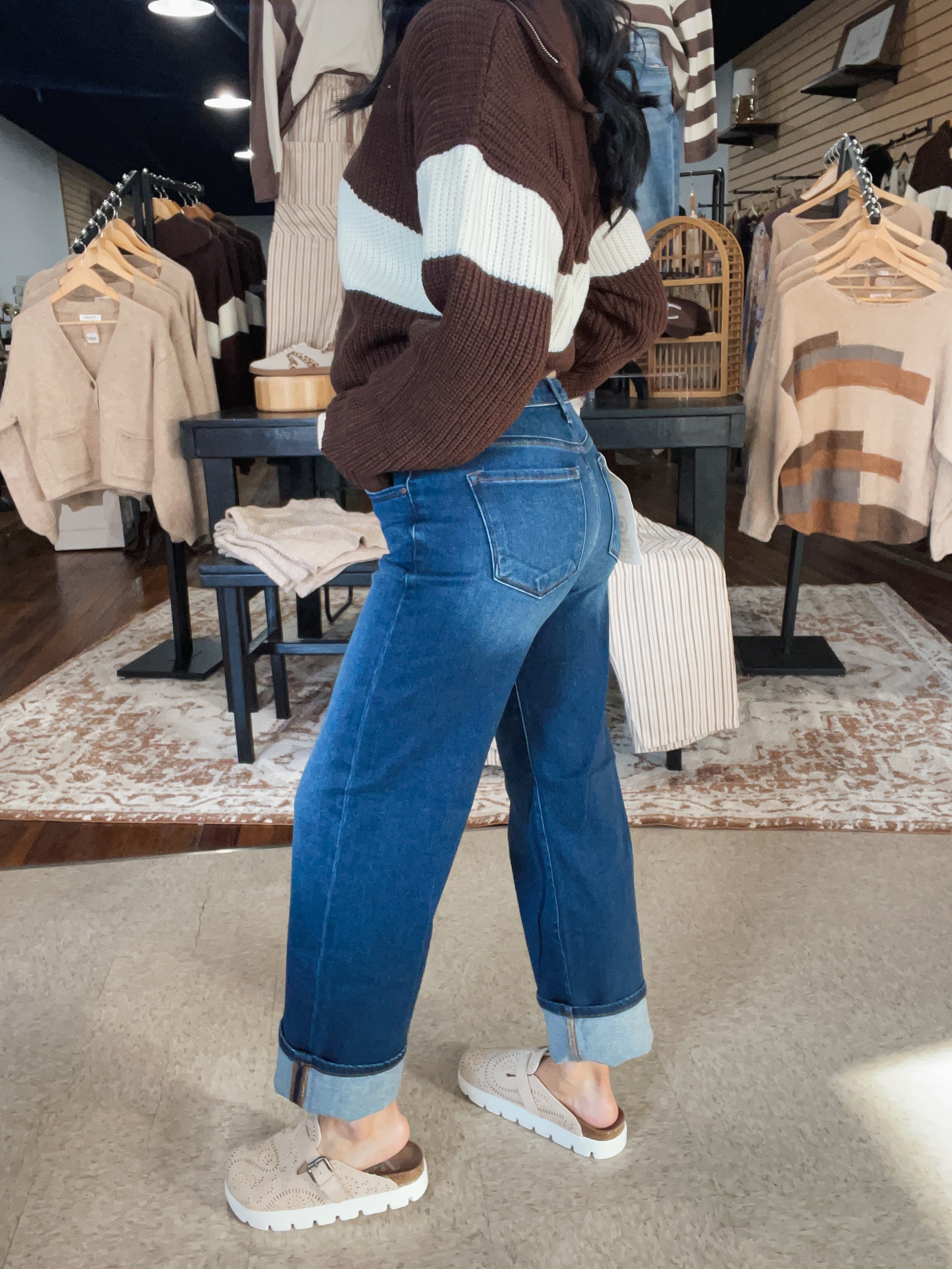 RISEN - The perfect dark wash straight leg! The most versatile denim we have in our wardrobe - pair with sneakers, loafers, sandals & even booties! TTS with a slight stretch! Erin is in a size 1!