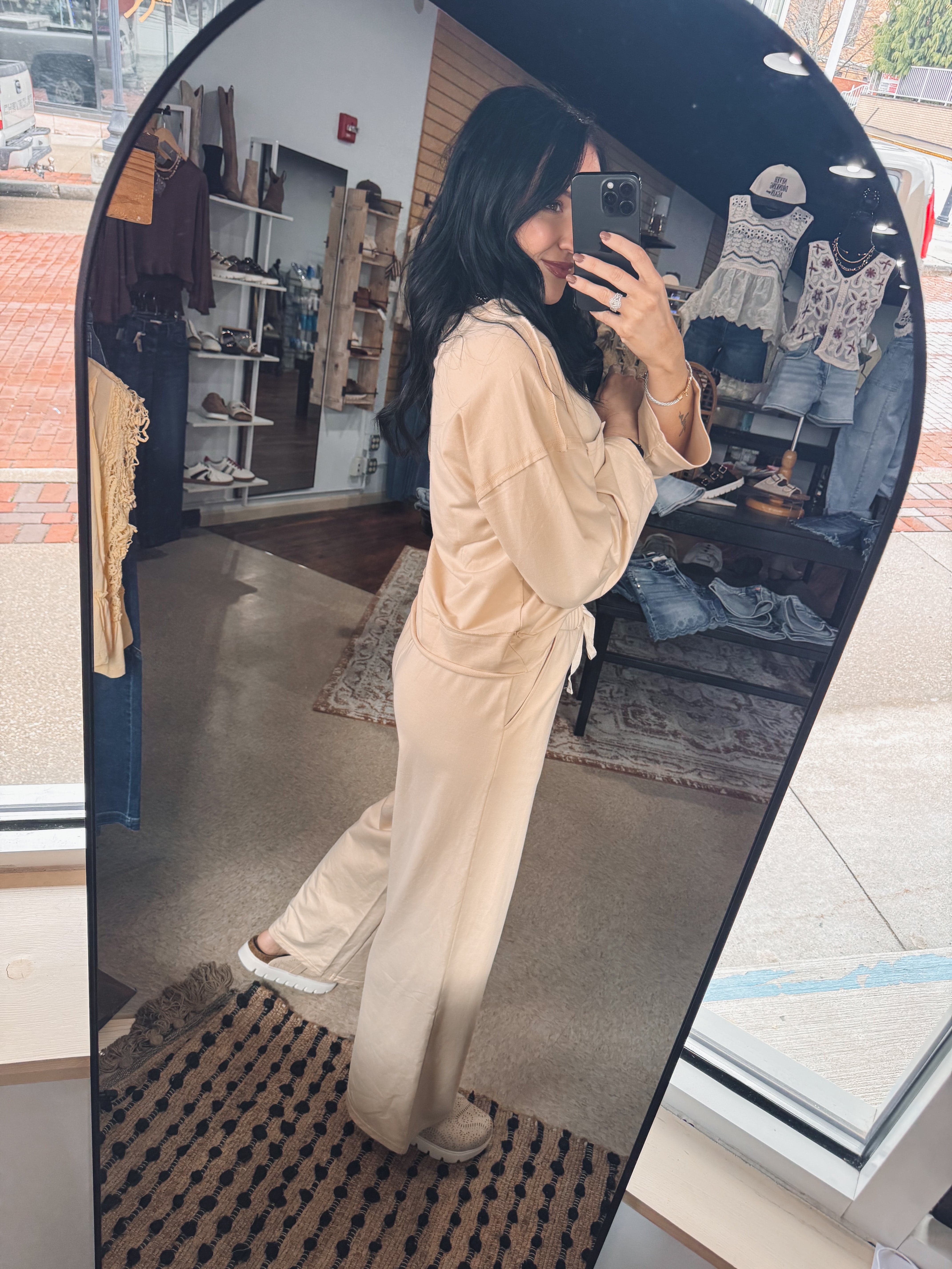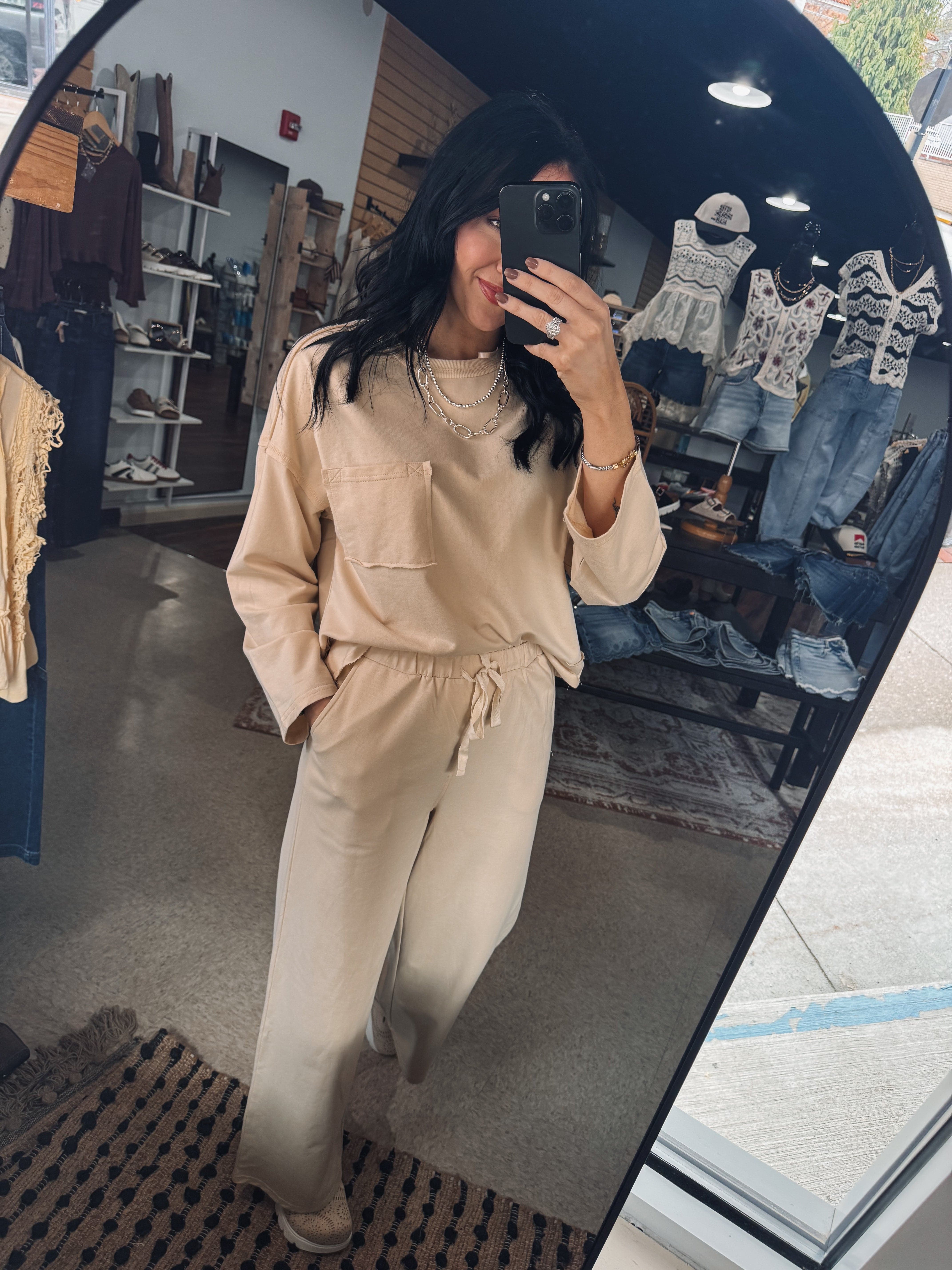 Effortless, comfortable, and still completely put together, this neutral lounge set brings elevated ease to everyday outfits with its soft fabric, relaxed long sleeve top, and flowy drawstring pants that create that perfectly styled but cozy look. TTS, Erin is wearing a small!