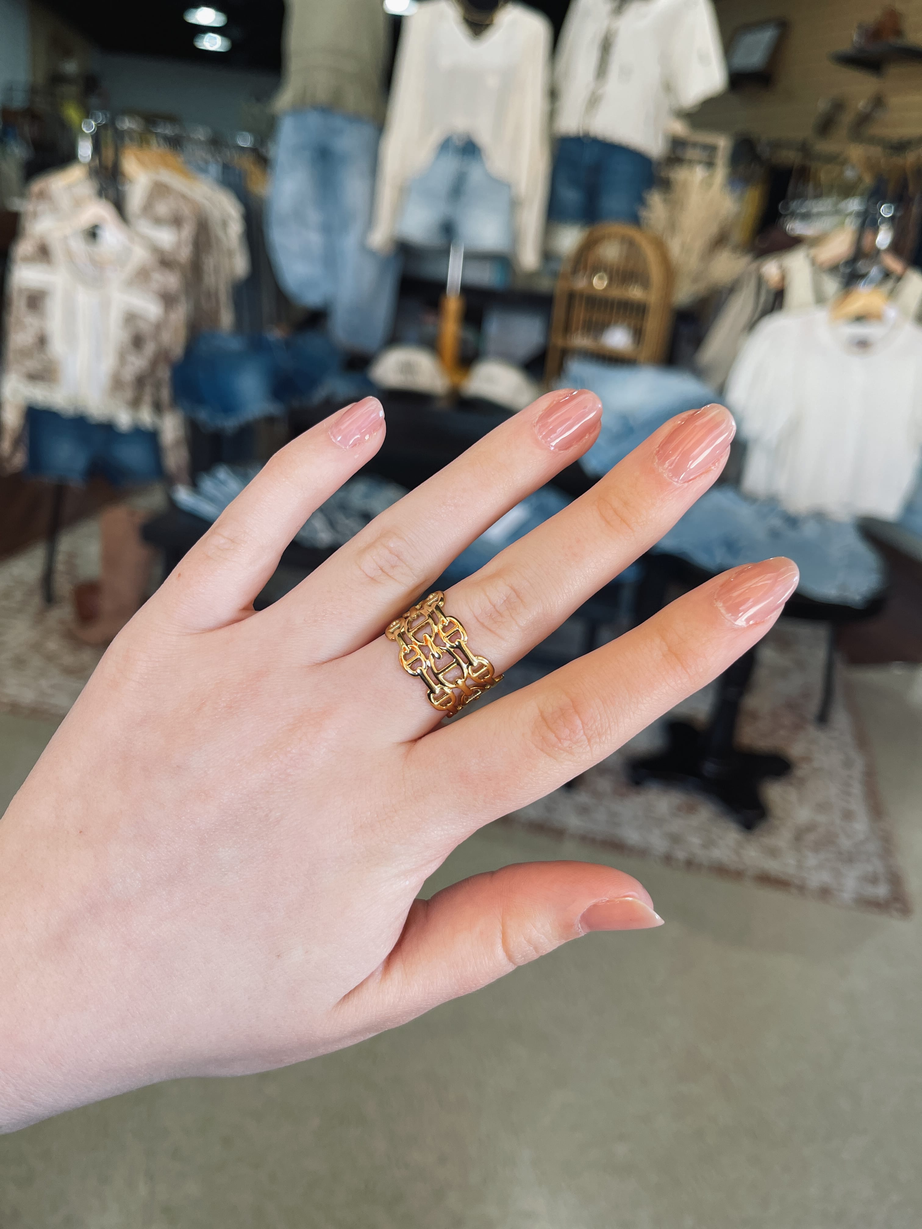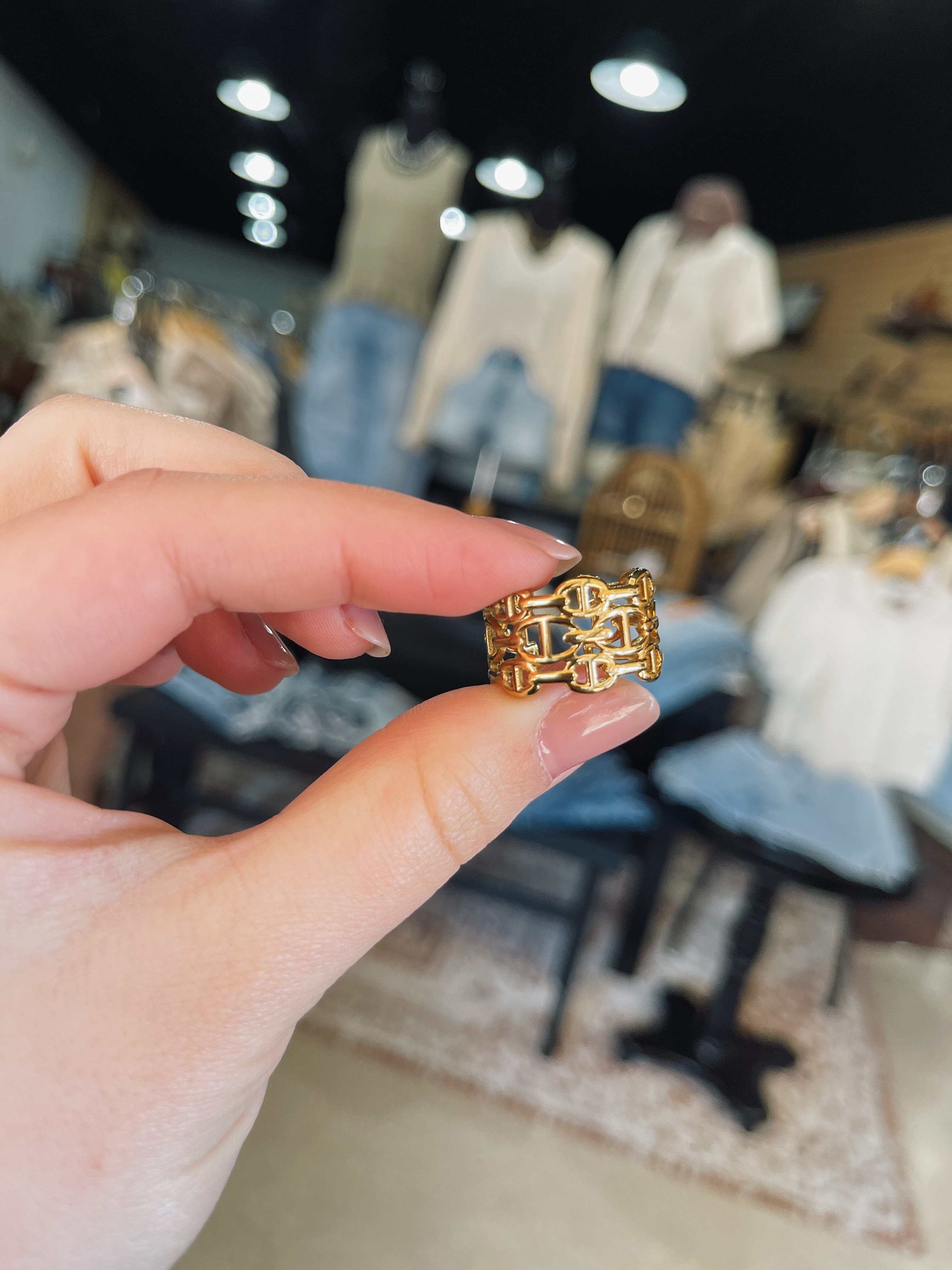 A bold gold ring with an intricate linked chain design that instantly elevates any look! The open, structured detailing gives it that statement feel while still being lightweight and wearable. Slightly adjustable in size, making it easy to get the perfect fit.