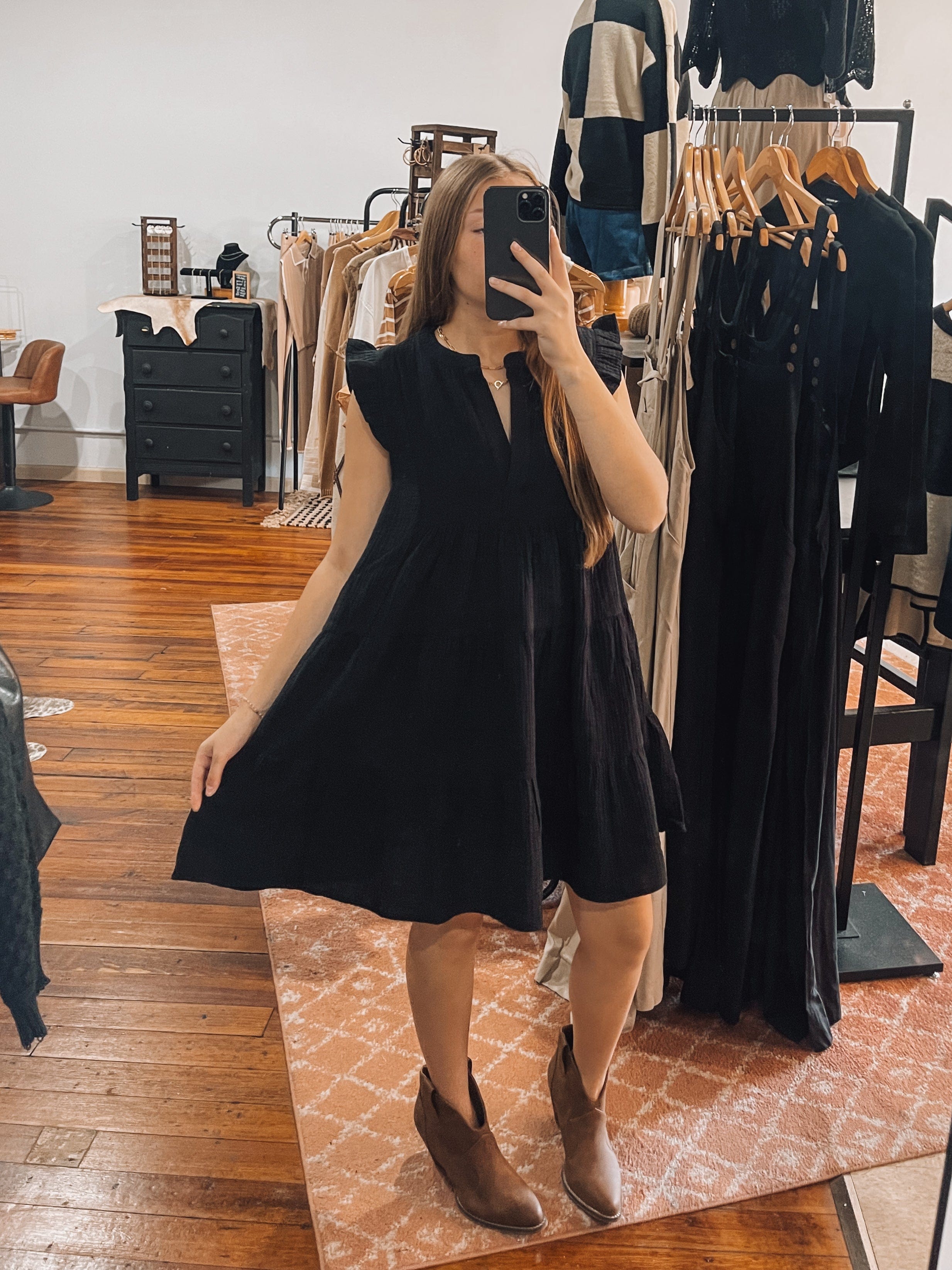 The perfect dress for Fall Family pics! Neutral to mix & match with other complimentary colors, while standing out with the Muslin Material! TTS, flowy fit, Hannah and Harleigh are both wearing a size Small!