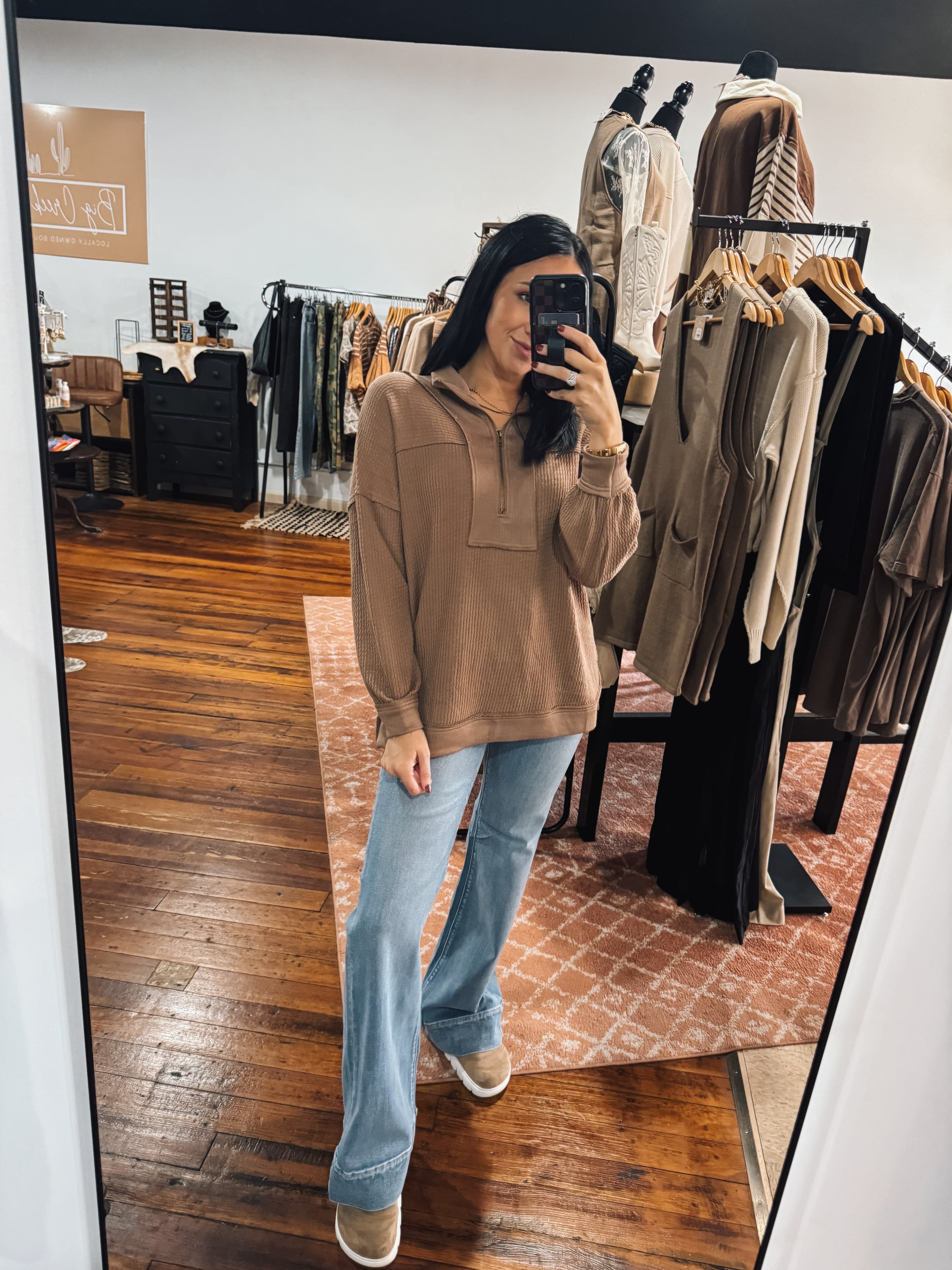 Taking the quarter-zip to the next level! Fun textures in the prettiest shade of brown! Oversized fit! Erin is wearing a size Small!