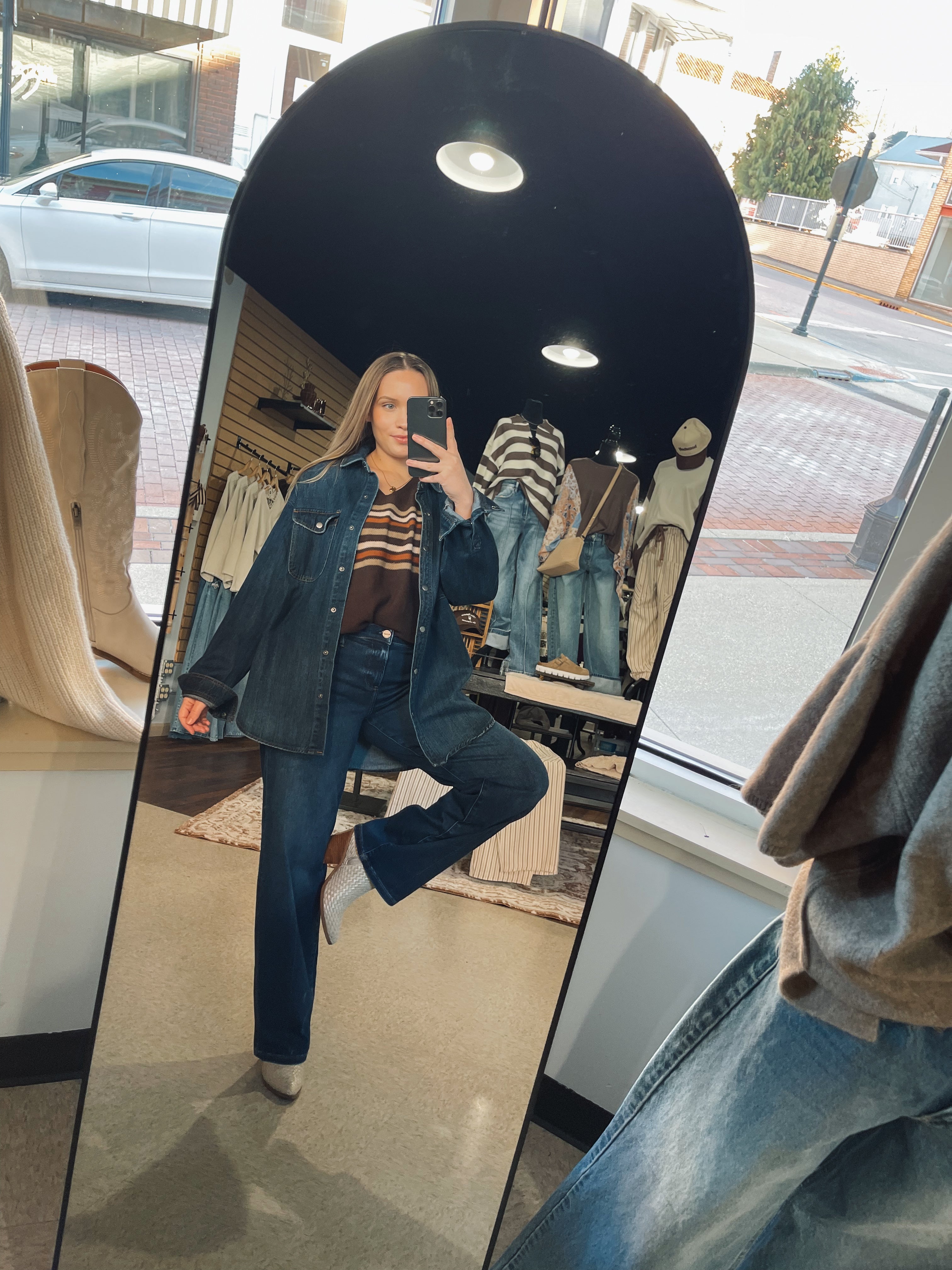 Oversized mid/dark wash denim! Snap buttons with the cutest front pocket details! Hannah is wearing a size S!