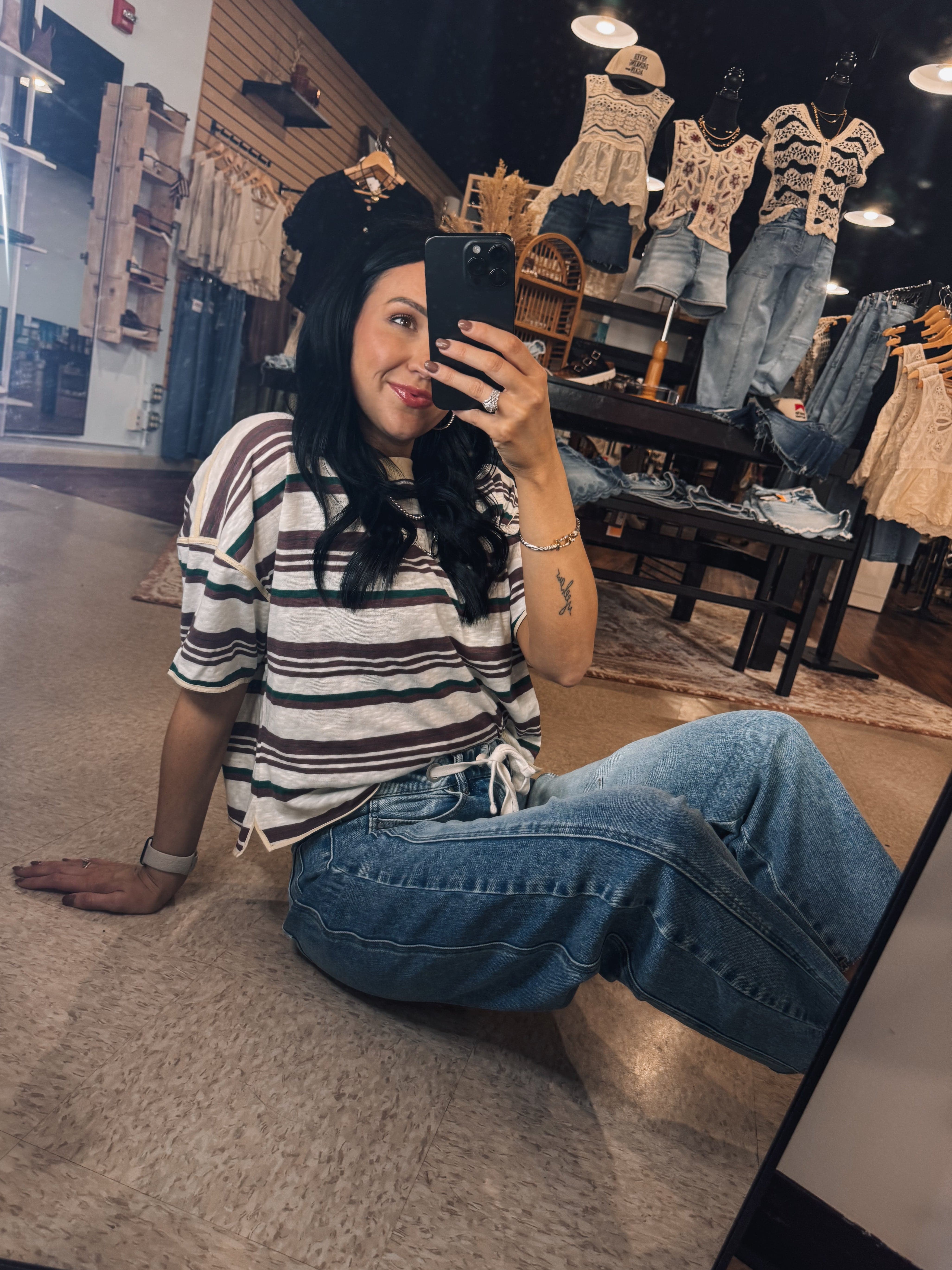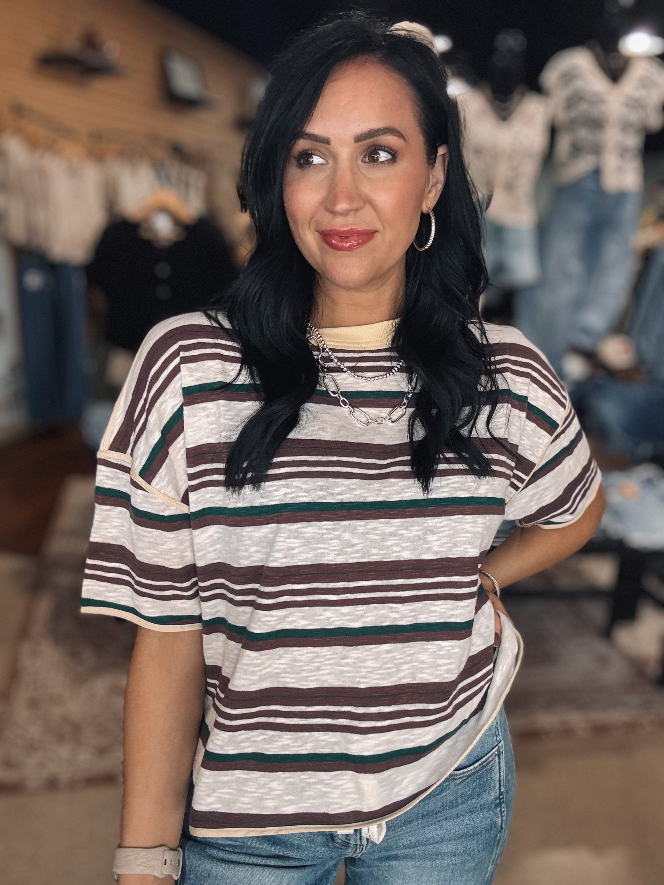 Classic stripes get a modern refresh with this relaxed tee featuring earthy mocha tones and a comfortable silhouette that makes everyday outfits feel effortlessly styled. TTS, in a square cut style, Erin is wearing a small!