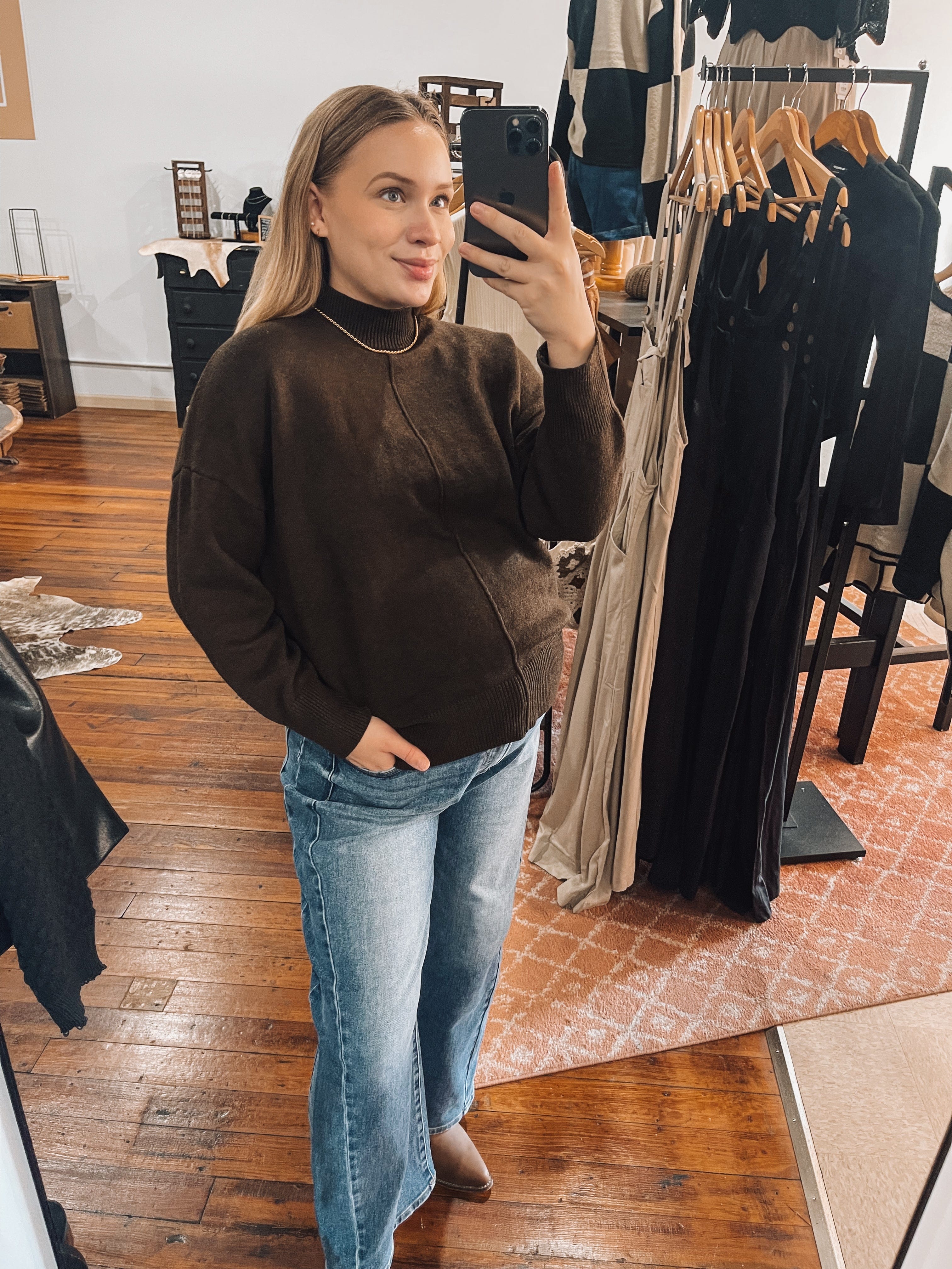 Deep mocha is *the* color of the season, and we’re LOVING it!! Mock neck, slightly oversized to tuck and play with style. TTS, Hannah is wearing a size Small!