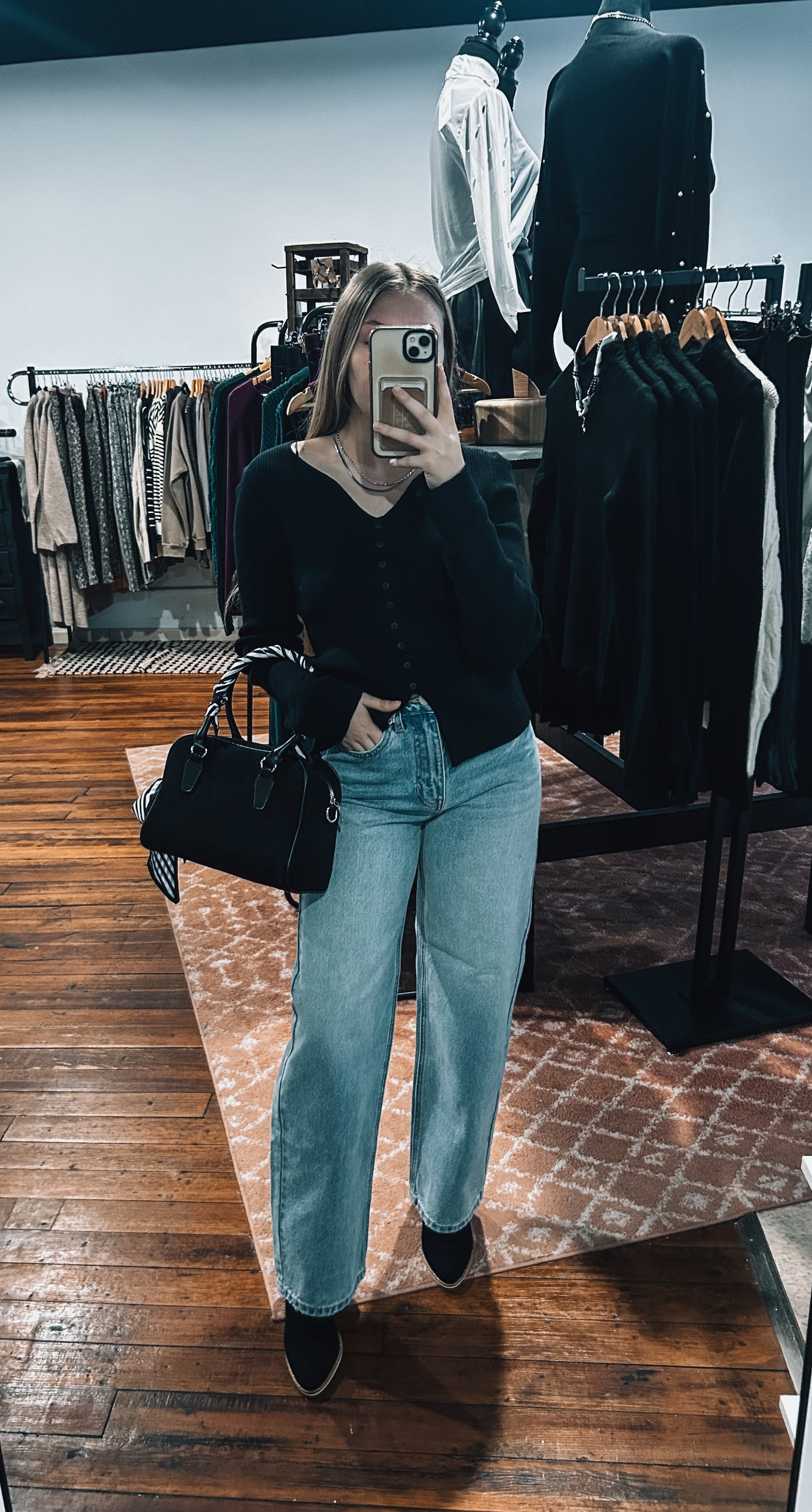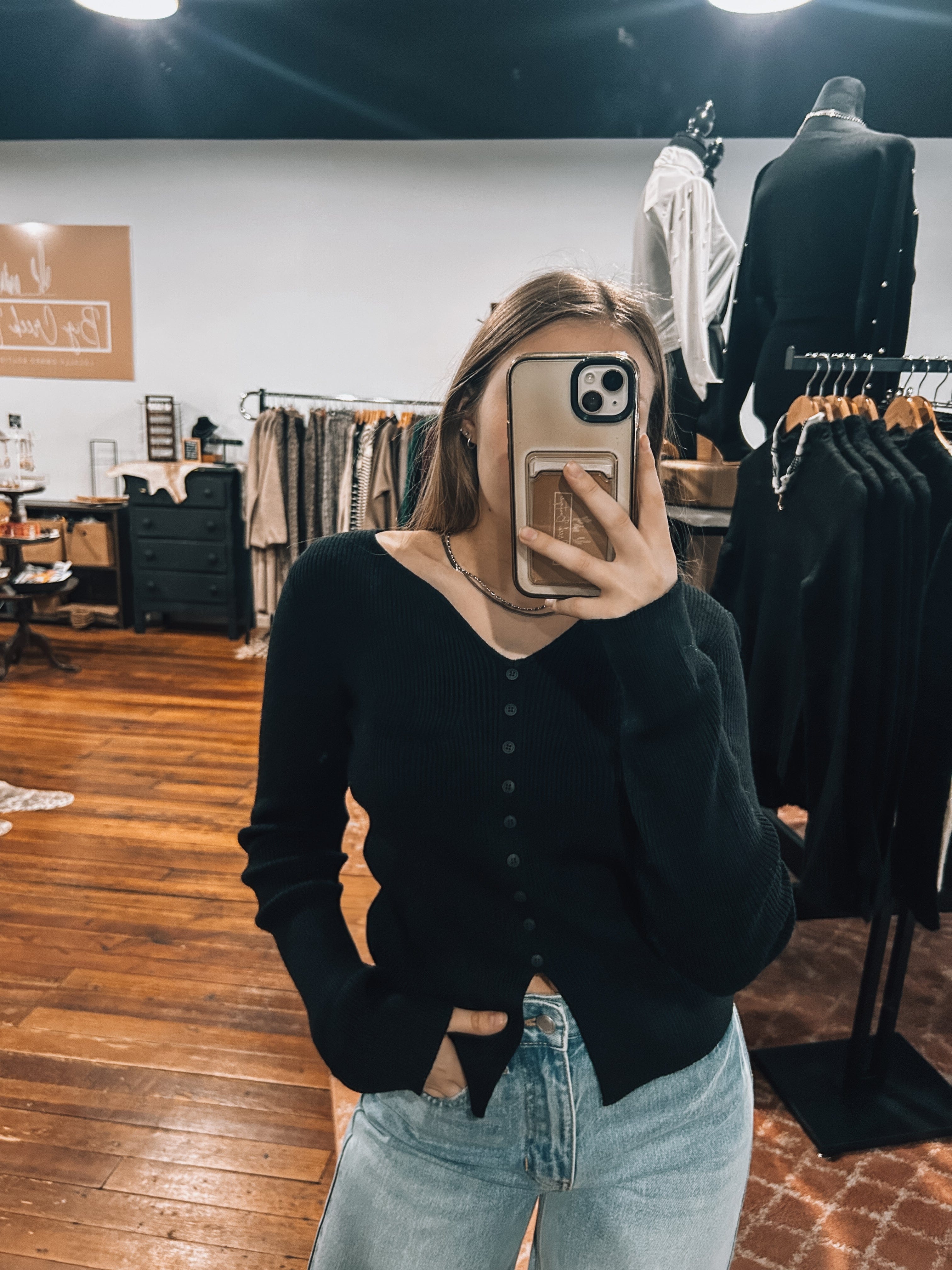 Unique v-neck that feels so flattering! TTS, Harleigh is wearing a size Small!