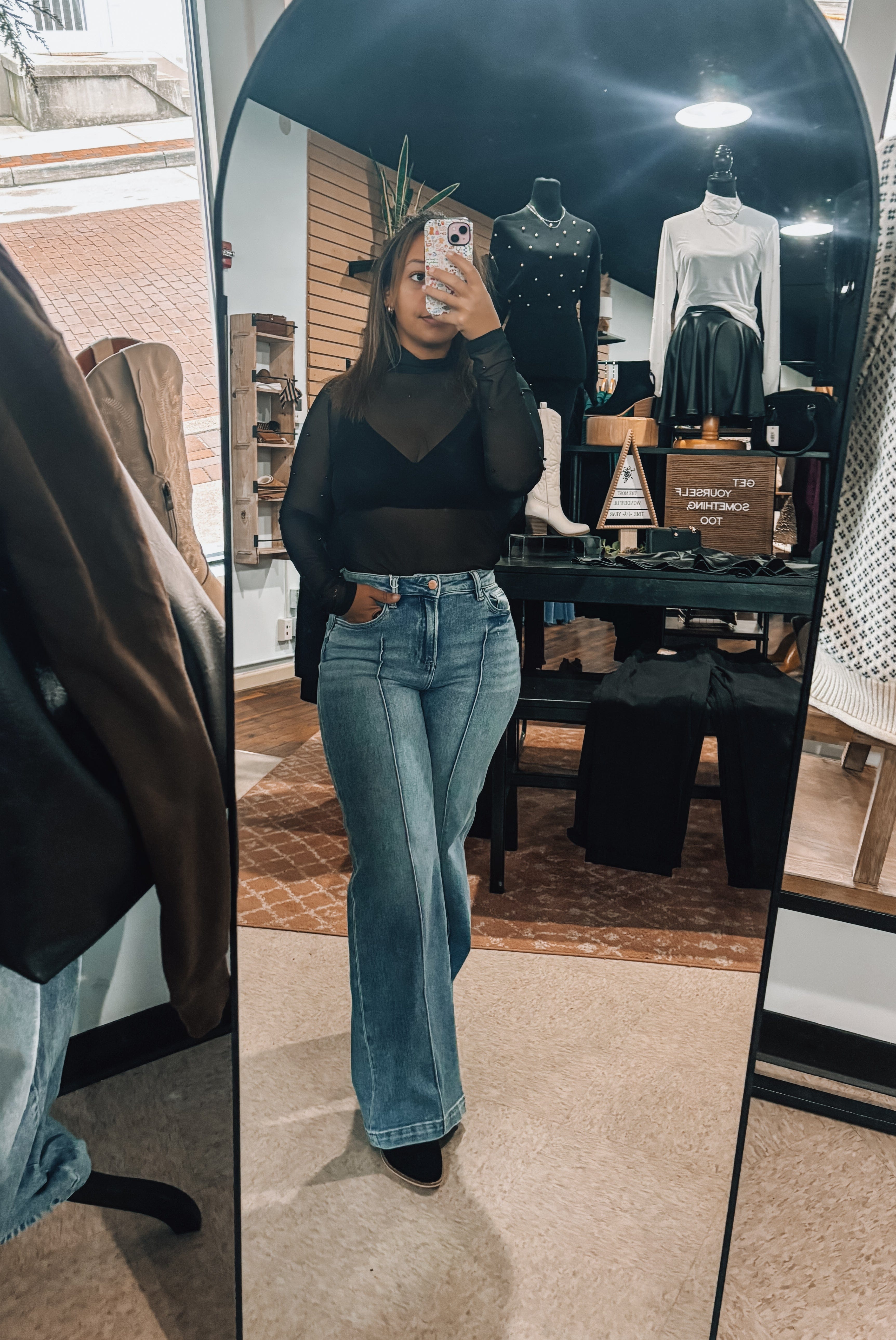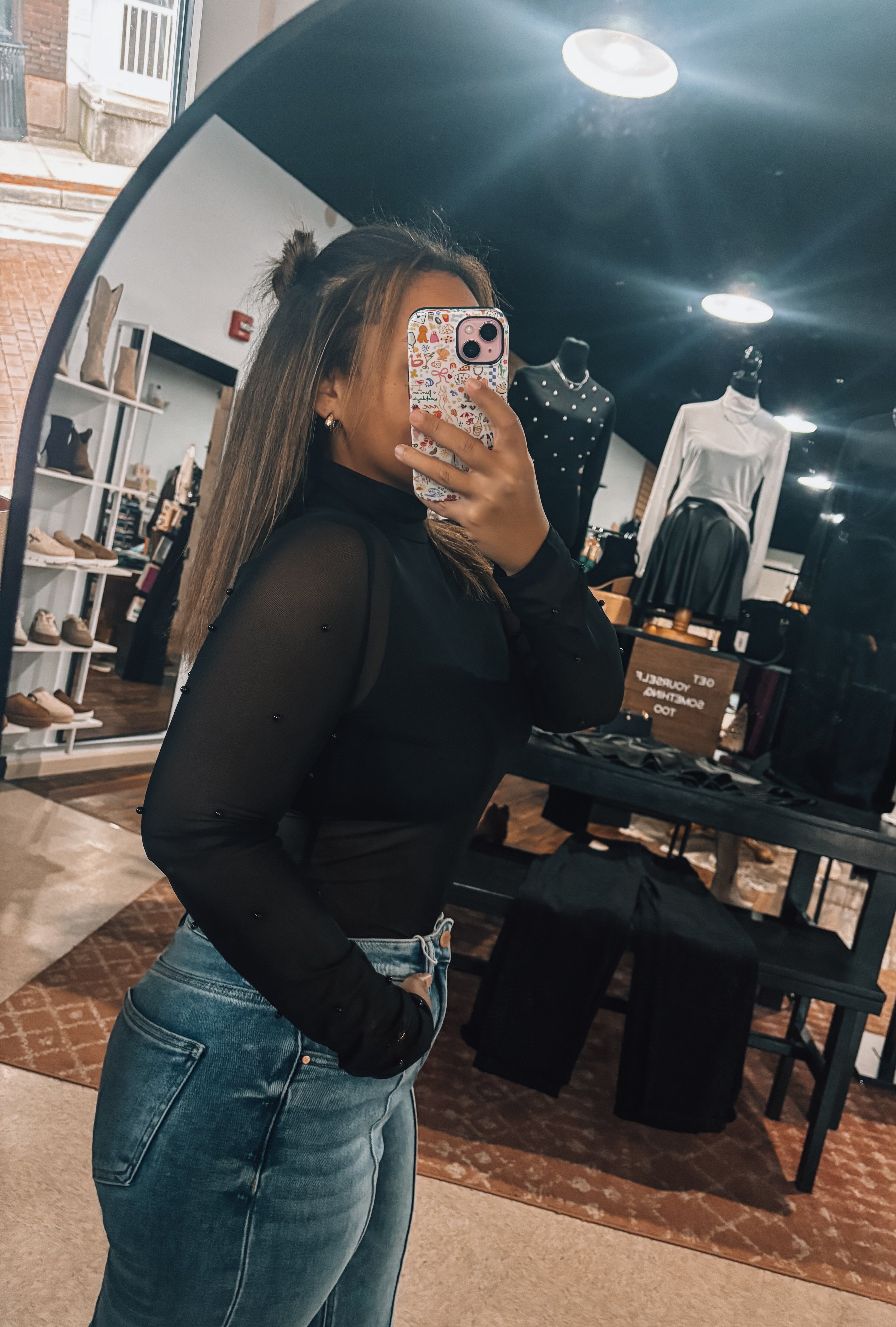 Sleek mesh with black pearl accented sleeves! SO many ways to wear! A gorgeous look on its own, even better when layered! TTS!