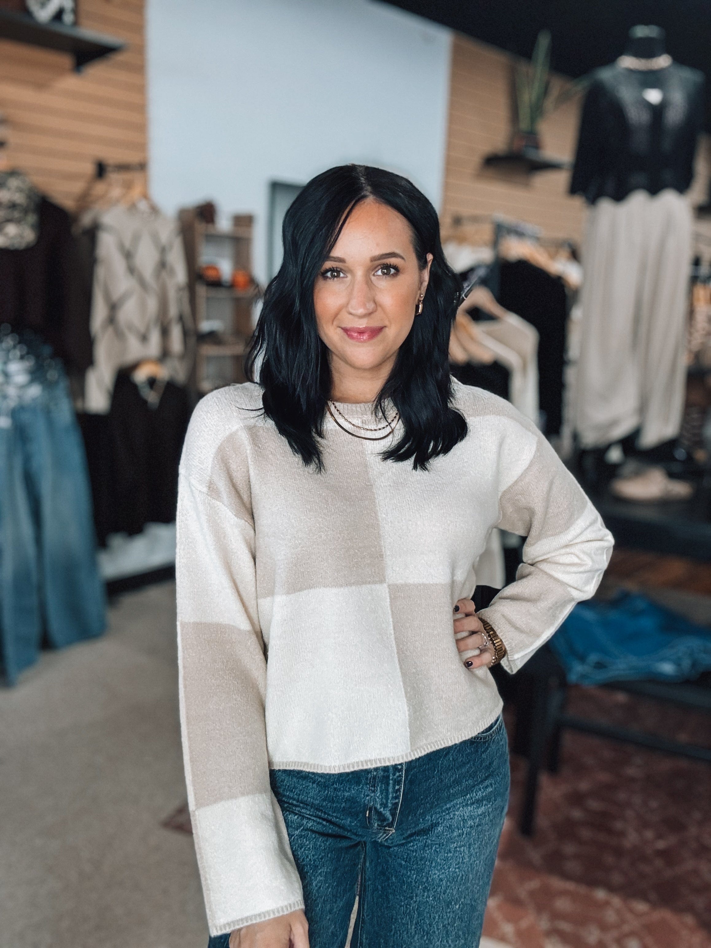 Checkered color block done in luxury! Gorgeous creams to create your monochromatic dream! TTS, Erin is wearing a size Small!