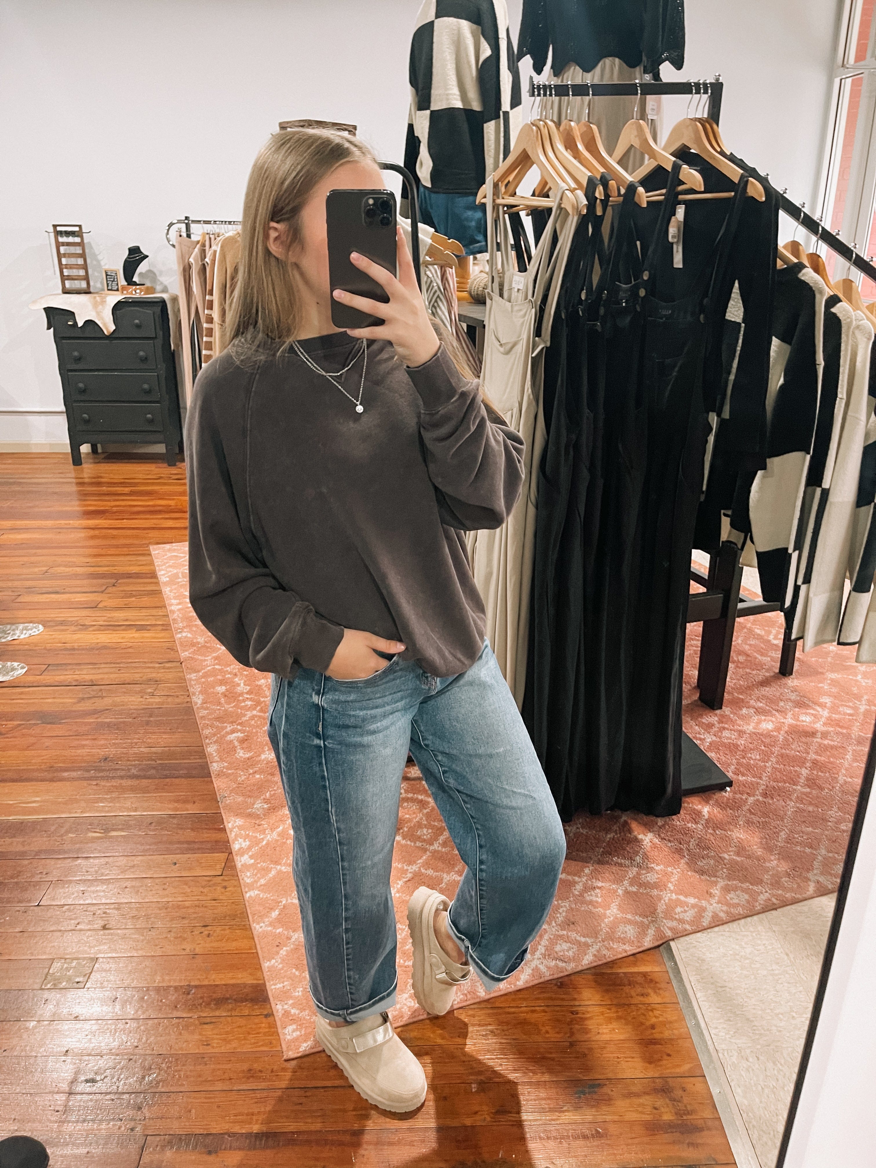 Charcoal brown, suuuper comfy! TTS, slightly oversized to layer, Harleigh is wearing a size Small!