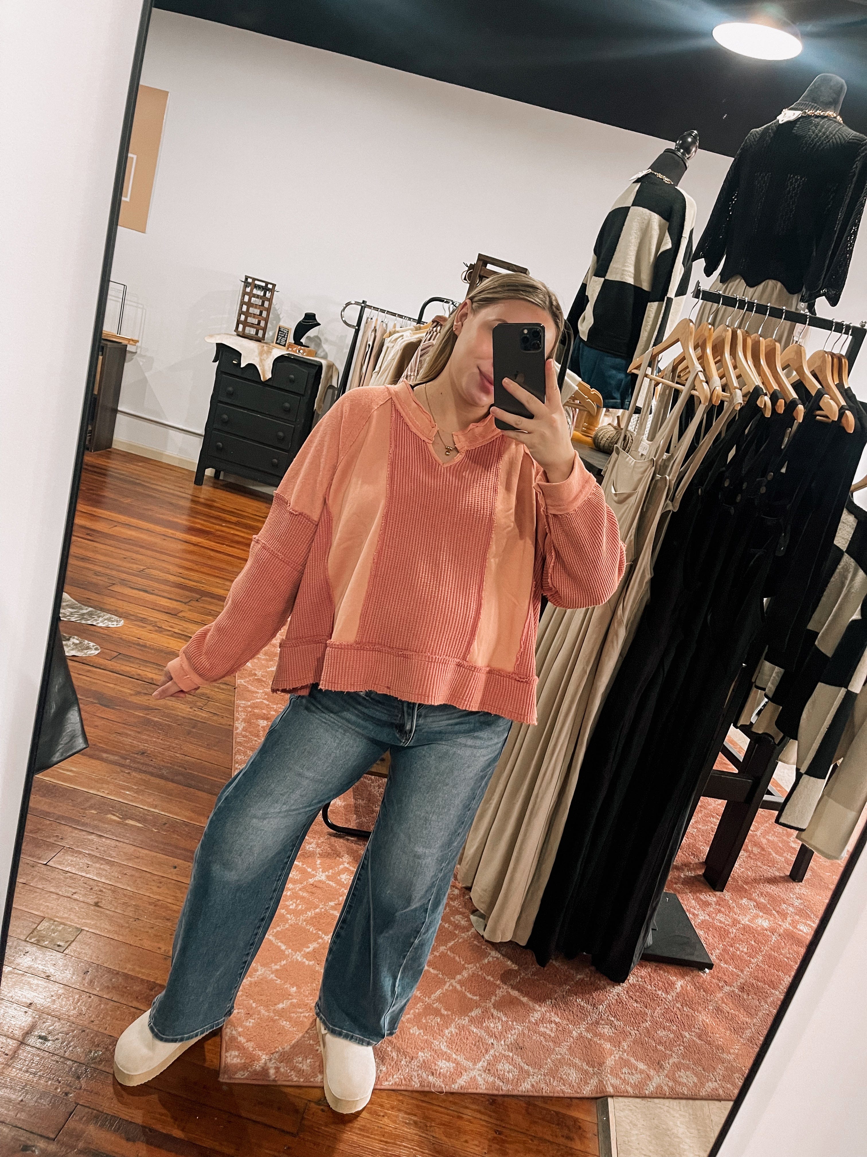 Not your average sweatshirt, this top feels elevated in every way! Raw hem, mix materials, soo cute! TTS, slightly oversized, Hannah is wearing a size Small!