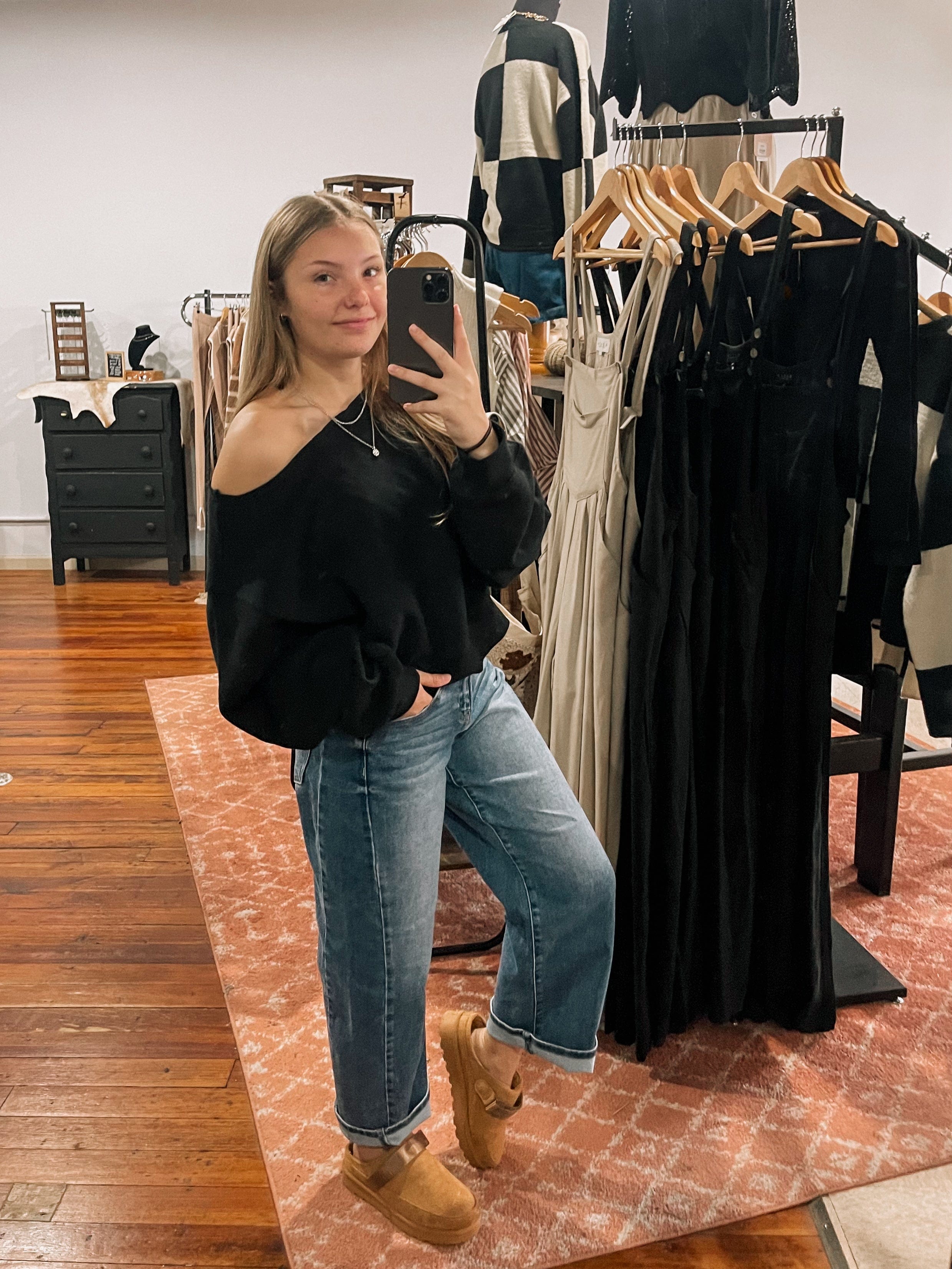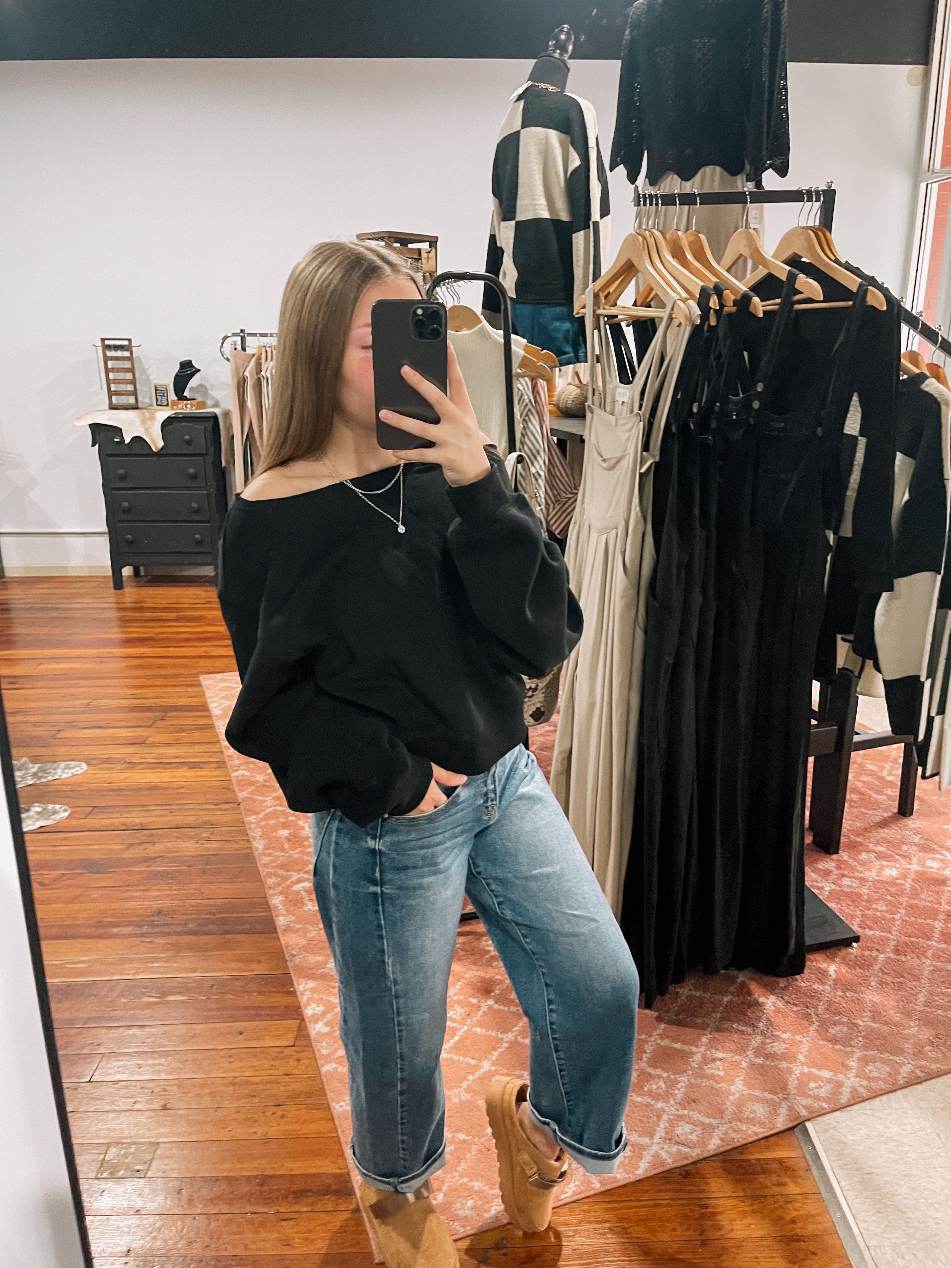 Wear off the shoulder or wide neck! Sooo cute for the days you want something to grab & go! TTS, slight crop, Harleigh is wearing a size Small!